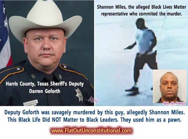 The latest black life that the puppet masters pulled the strings on is allegedly Shannon Miles, the man arrested for the heinous murder of Harris County, Texas Sheriff’s Deputy, Darren Goforth.  Whether it is proven to have been Shannon Miles or not, one thing is certain: a Black Lives Matter representative followed the New Black Panthers missive to creep up on a police officer under the cover of darkness to murder him.  Deputy Goforth was minding his own business filling his car with gas.  His murderer crept up from behind, in the darkness, and did the unthinkable.  Unthinkable until Black Lives Matter became a movement.  Now it’s becoming all too common.